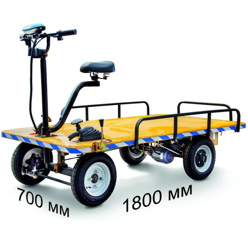 Платформенная тележка оснащена электродвигателем на 750 Вт. Способная развивать скорость до 25 км/час и преодолевать на одной подзарядке дистанцию до 30 км. Платформа оснащена ограничителями, благодаря которым исключено падение груза и другие форс-мажорные ситуации. Управление – простой – не требует особого обучение.