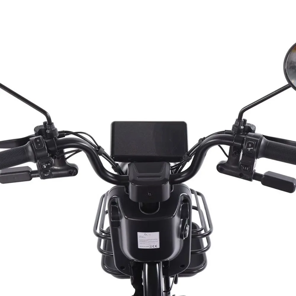 Два сиденья, корзина, багажник, зеркала, поворотники, стоп-сигналы и фара — полный набор для повседневной жизни.